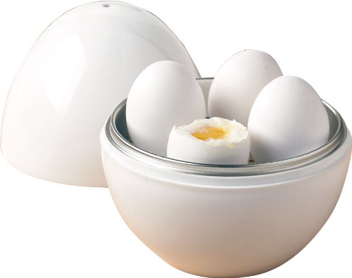 Description : Enjoy perfectly boiled eggs from the microwave in minutes, without the worry of exploding shells. To cook up to four hard or soft boiled eggs, just add water to base, place eggs in the indented cups, snap top shut, and power up! Instructions included. Aluminum and plastic. 6" x 5". Hand wash.